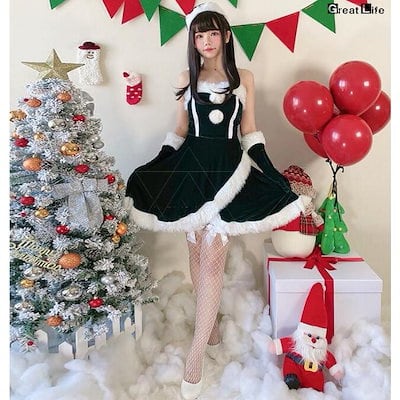 クリスマス コスプレ衣装 ベアトップ 緑 クリスマスドレス レディース サンタコス ドレス+グローブ+帽子 クリスマスパーティー コスチューム イベン