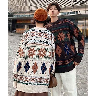 トップス メンズ レディース セーター ニット クルーネック ペアルック リンクコーデ お揃い 長袖 ブラウン ホワイト ノルディック柄 秋冬 クリスマス 誕生日 プ