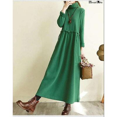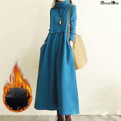 ロングワンピース レディース ワンピース 長袖 無地 ロング丈 春 秋 冬 ハイネック タートルネック ロング丈 裏起毛 ハイウエスト ギャザー ポケット付き ボア