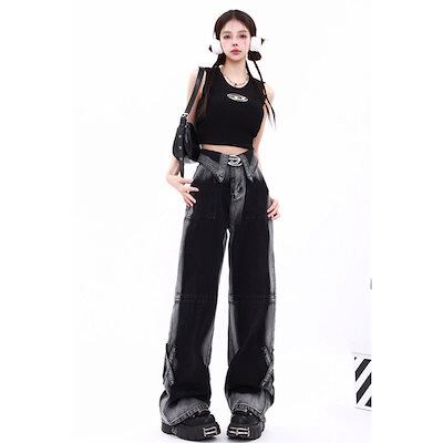 大きいサイズアメリカンレトロデザインセンス衝突ジーンズ女性秋冬ストレートワイドパンツ潮