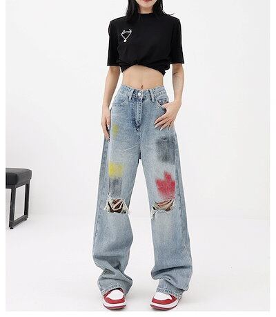 デニムパンツ 落書き青水洗 破穴ジーンズ ワイドパンツ モップストレートパンツ ボトムス レディース 美脚 デニムパンツ