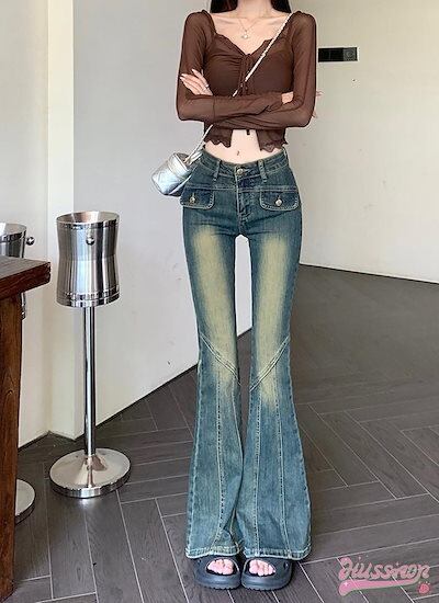 2024春夏 アメリカン パンツ デニム ブルー ジーンズ ロング丈 スキニー レッグ加工 ハイウエスト 脚長効果 美脚効果 細見え 秋 カジュアル 韓国ファッション お出かけ
