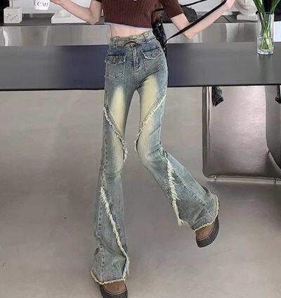 2024春夏 アメリカン パンツ デニム ブルー ジーンズ ロング丈 スキニー レッグ加工 ハイウエスト 脚長効果 美脚効果 細見え 秋 カジュアル 韓国ファッション お出かけ1