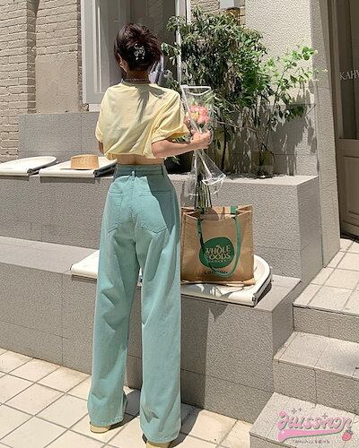 パンツ デニム ジーンズ ワイド ストレート ハイウエスト 脚長効果 美脚効果 細見え 春 ビビットカラー カジュアル 韓国ファッション レディース お出かけ