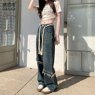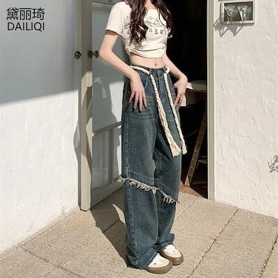 デニムパンツ レディース オリジナル ストレートジーンズ ハイウエスト 薄手 ゆったりパンツ カジュアルパンツ ハイウエスト