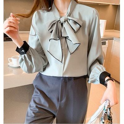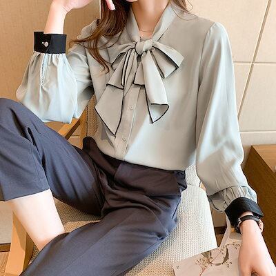 ブラウス レディース きれいめ オシャレブラウス シルク風シャツ 長袖トップス リボンvネックブラウ