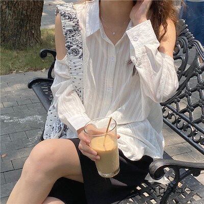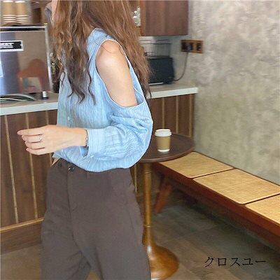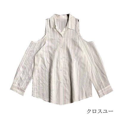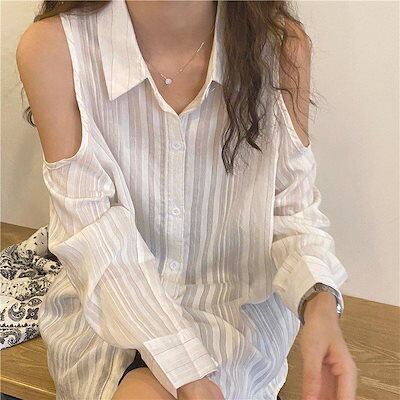 レディースファッション 2色 肩出し シャツ ブラウス ストライプ 襟付き 可愛い 個性的 長袖 春 トップス 夏 白 青 キュート きれいめ モテる レディース