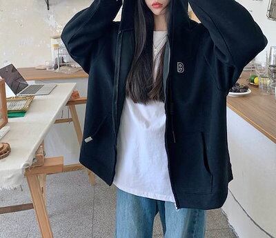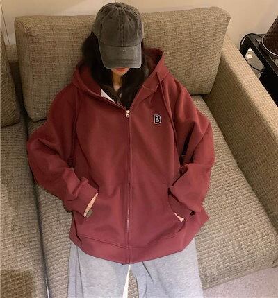 英字 フード付き ジップアップ パーカー ジャケット レディース トップス 部屋着 アウター 羽織 丈長 長袖 ドロップショルダー フード ストリート ファスナー ポケット 前開き ドロスト 裏起毛