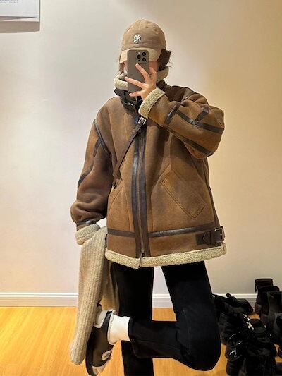秋冬防寒 あったかアウター 韓国風コートスタイルアップ かわいい ブルゾンファー付きファッション系裹起毛大人ゆったりカジュアルストリートサイズレディースムートン襟エコゆるダボ シルエット学生通学丈