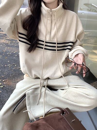 2024 秋冬 韓国 かわいい レディース厚手 裹起毛無地ハイネック長袖アウターレトロセット黑白フーディーハーフサイズ丈トップス春カジュアルスポーツファッション系通学学生袖お出かけアップシルエット