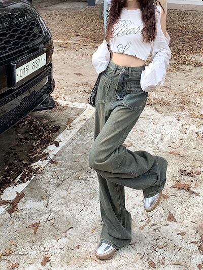 2024 春夏 パンツ デニム ジーンズ ロング丈 レッグ ストレート 脚長効果 美脚効果 細見え 秋 かわいい加工 カジュアル ファッション レディース お出かけ