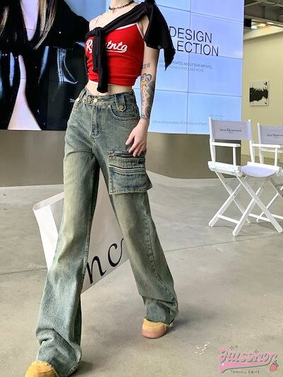パンツ デニム ジーンズ ワイド ストレート ハイウエスト 脚長効果 美脚効果 細見え ウォッシュ加工 フリンジ 春 カジュアル 韓国ファッション レディース お出かけ
