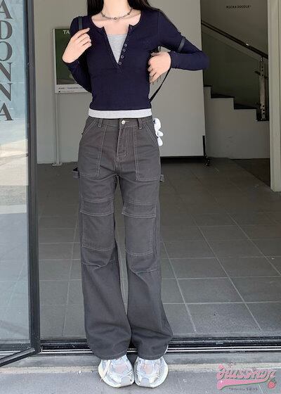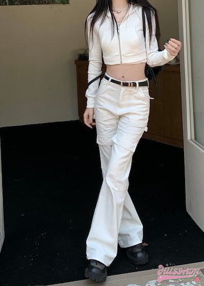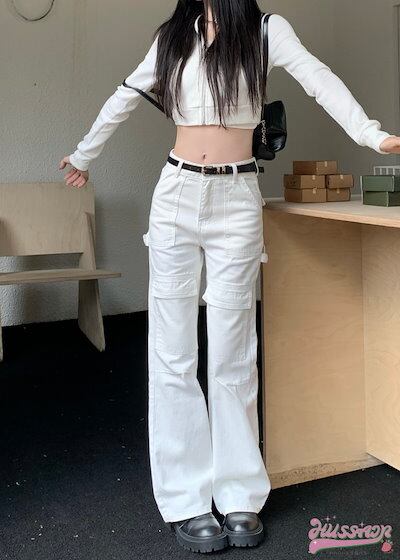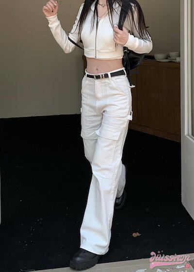 パンツ カーゴパンツ ワイド ストレート ハイウエスト 脚長効果 美脚効果 細見え 春 白 カジュアル 韓国ファッション レディース お出かけ