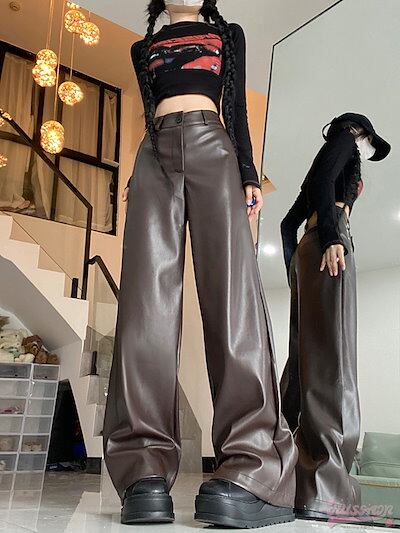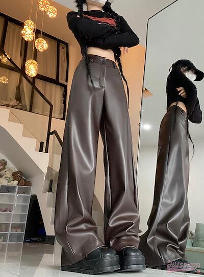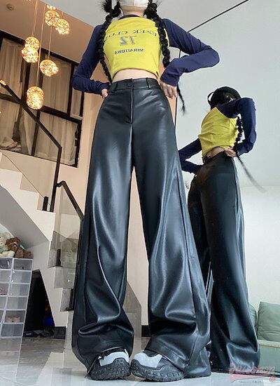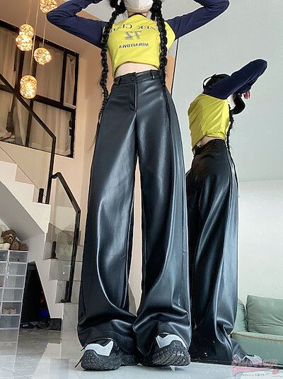 アメリカン ワイドパンツ PUパンツ ファッション モップロングスリムパンツ スタイルアップ カジュアル きれいめ ゆるっと サイズストリート 大人っぽ ズボンお姉さん ユニセックスシルエット秋冬