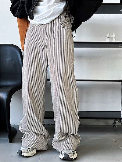 パンツ ワイドパンツ レディース ストライプ柄 春 秋 冬 長ズボン ロング丈 チノパンツ ポケット付き タックパンツ シンプル 柄パンツ 綿 コットン ゆったり 体型カバー ボトムス ストレート 個