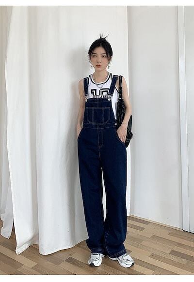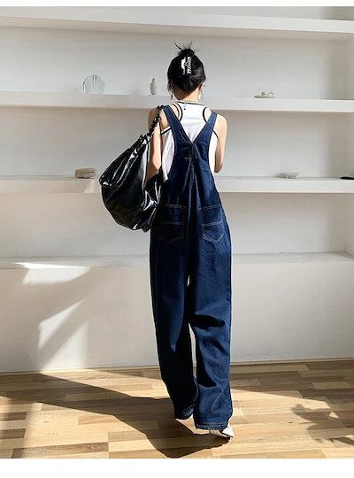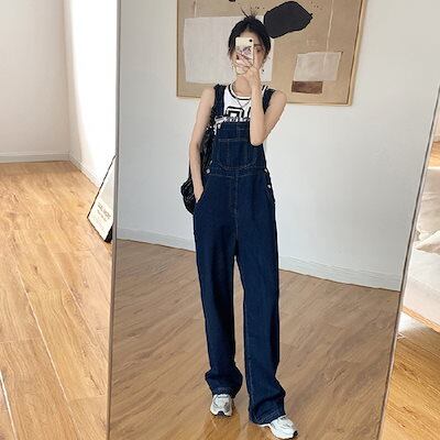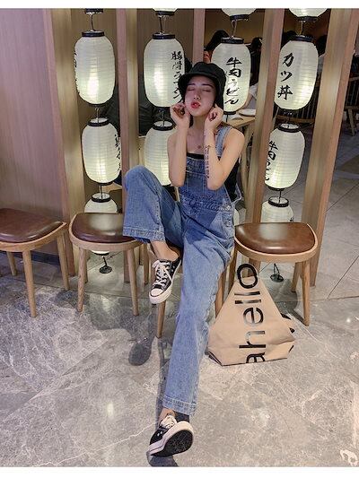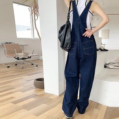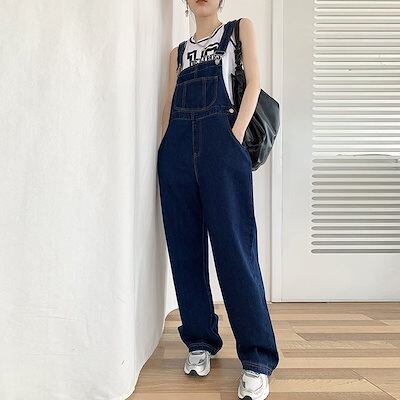 レディース デニム ストラップ ワイドパンツ オールインワンパンツ サスペンダーパンツ デニムパンツ ストレート ロングパンツ デニムジーンズ