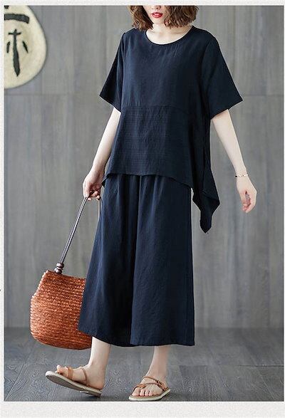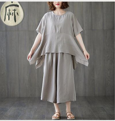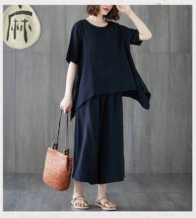 セットアップ レディース カジュアル 夏 綿麻風 2点セット 上下セット チュニック ブラウス ワイドパンツ tシャツ 半袖 バギーパンツ イージー フレアパンツ 涼しい カジュアル ナチュラル 大き