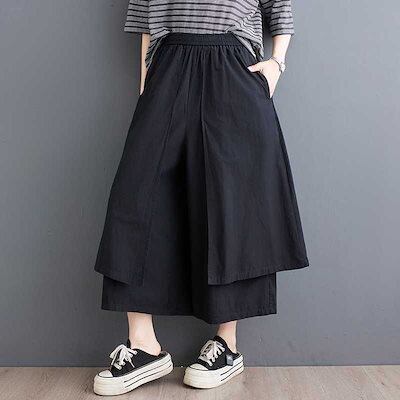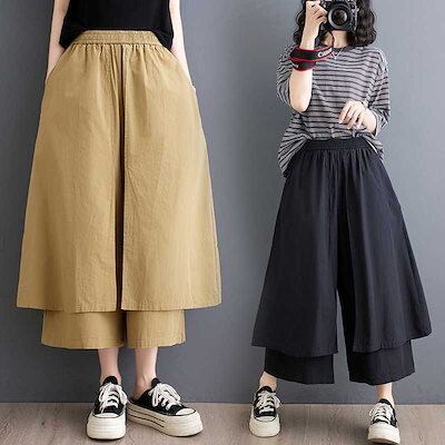 「ファットガール」 2024夏新品 ワイドパンツ キュロットスカート 無地 ハイウエスト レイヤード ニセ2SET レディース ロングパンツ メガ割
