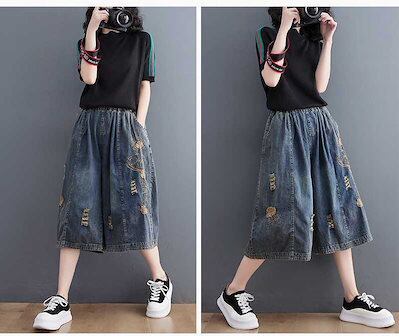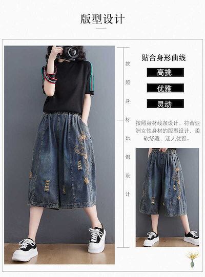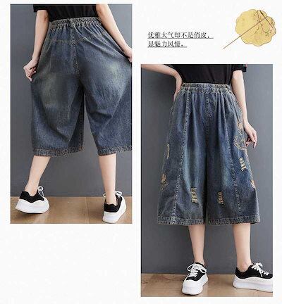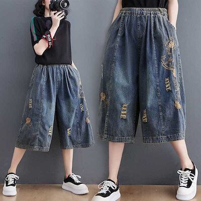 「ファットガール」 2024夏新品 七分丈 ワイドパンツ デニムパンツ ゴム 刺繍 大きいサイズ 体型カバー レディース パンツ メガ割