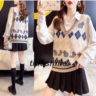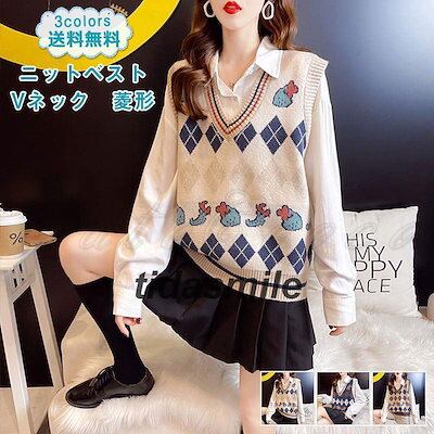 ニットベスト レディース ベストセーター Vネック 菱形 ノースリーブ トップス カジュアル コーデ 暖かい 可愛い ゆったり 春秋冬 おしゃれ