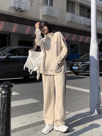 2024 秋冬 2点セット トップス お出かけ 羽織り ショート丈 セットアップフルパーカーラウンドヘムルーズ サイド上下ボトムス ストレート系冬 ゆったりサイズワイドシルエットリラックストラック