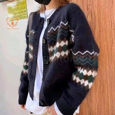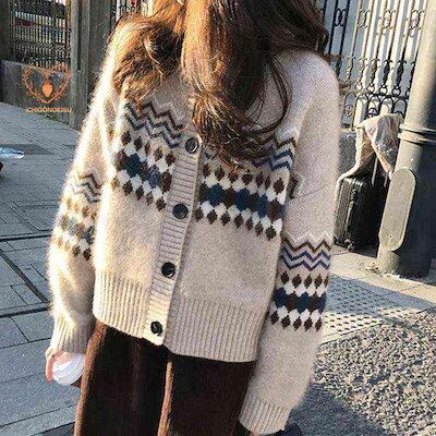 ニット カーディガン クルーネック ボタン ノルディック柄 レディース 長袖 アーガイル柄 羽織り ショート 春 秋 冬 シンプル カジュアル アウター コンパクト