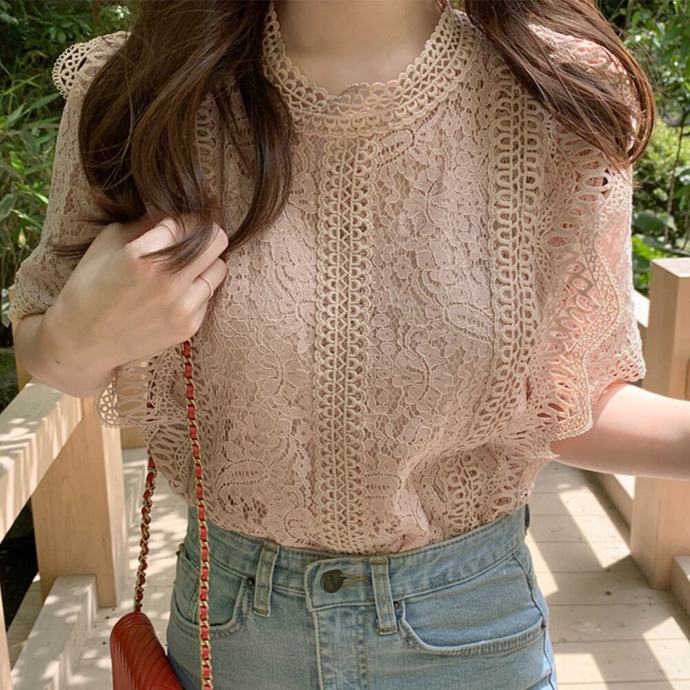 【日本倉庫即納】 総レース ブラウス レディース 刺しゅうレース トップス フリル 半袖