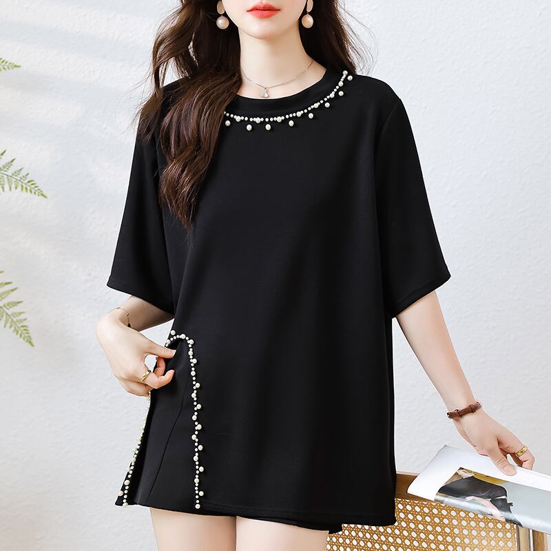 初回送料無料 夏のTシャツ 半袖のビーズ付き中長上着 ゆったりサイズブラウス 人気