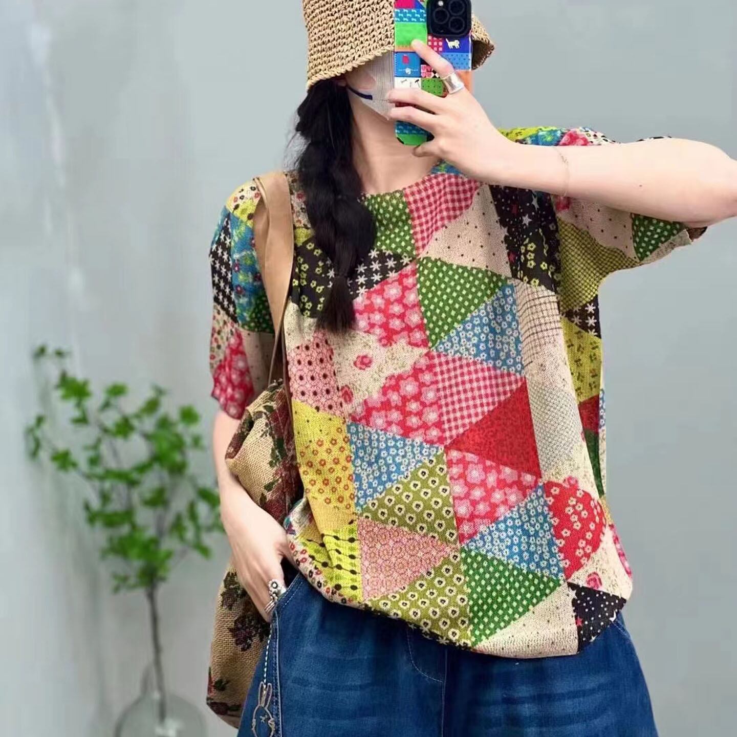 初回送料無料 プリント涼しいニットトップス 半袖クルーネック レディースファション上着 人気商品