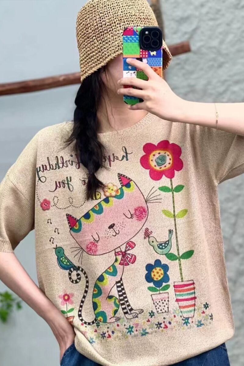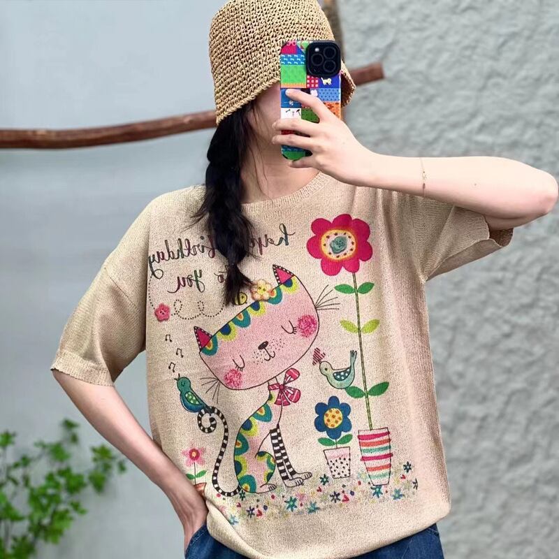 初回送料無料 プリント半袖クルーネックTシャツ ゆったりサイズ上着 カジュアルブラウス 人気商品