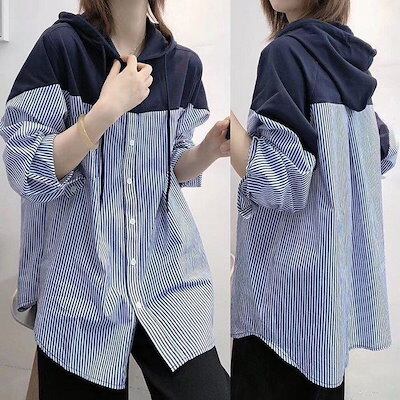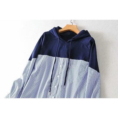 パーカー レディース シャツ 40代 春夏 韓国風 プルオーバー パーカー 切り替え 長袖 可愛い ストライプ柄 大きいサイズ フード付き 20代 30代 おしゃれ