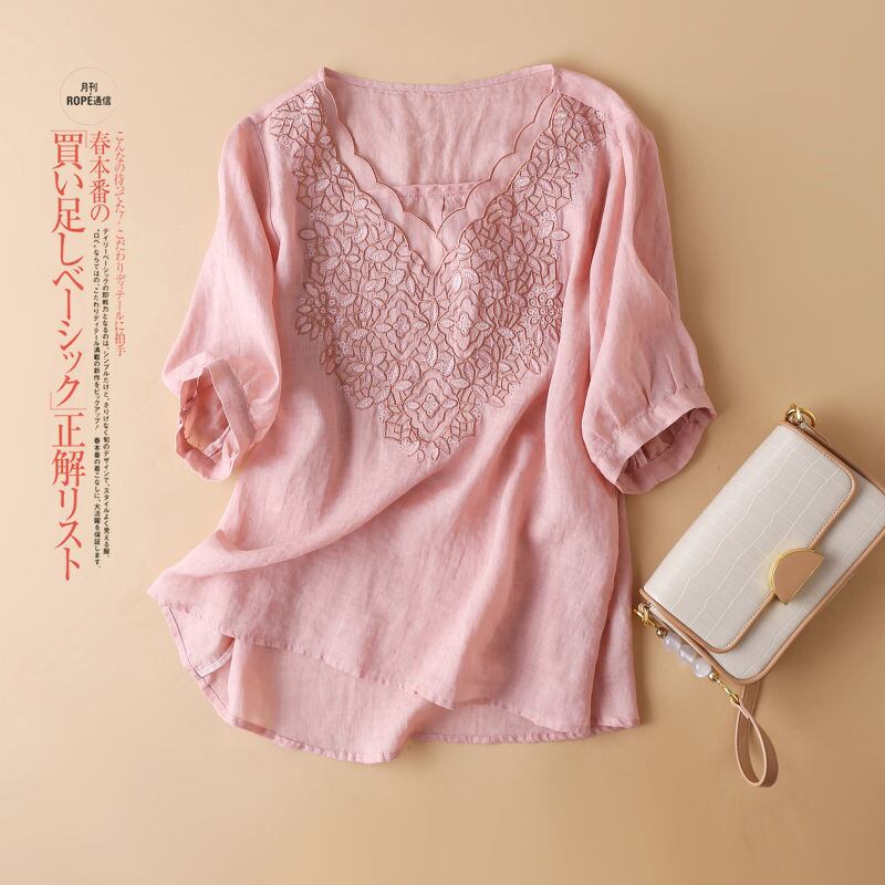 初回送料無料刺?シャツゆったりサイズVネックトップスコットンリネンプラスサイズ