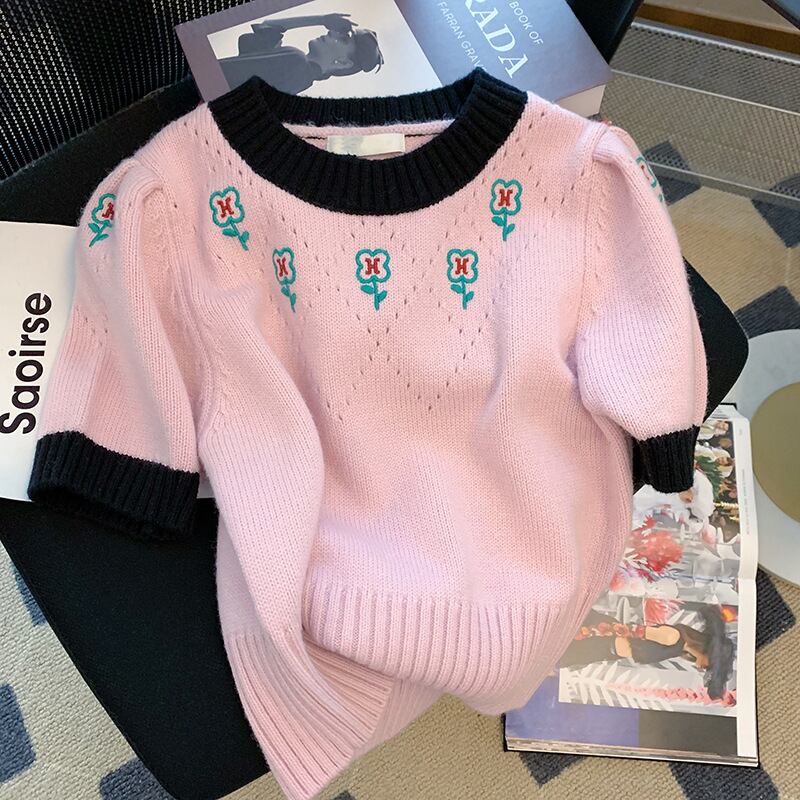 初回送料無料トップパフスリーブ刺?ニットトップフラワーレディースファショントップス
