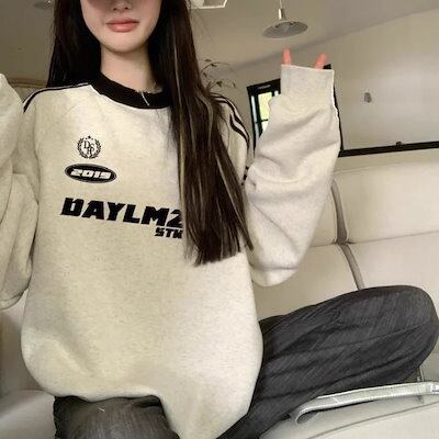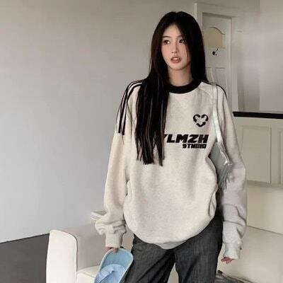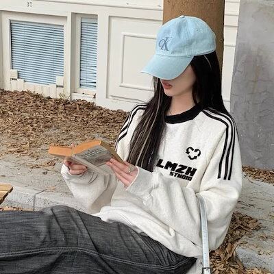 ライン スウェット トレーナー レディース 韓国 ファッション 裏起毛 ビッグシルエット ロゴトレーナー ミックスグレー 秋冬トップス