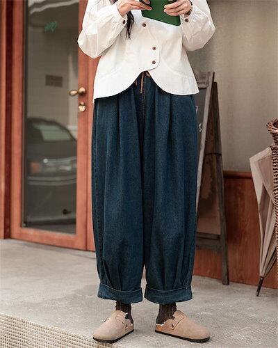 2024新作 デニムパンツ レディース イージーワイドパンツ ボトムス パンツ ウエストゴム ゆったり 美脚 レトロ リラックス 秋 冬 無地 ガウチョ ポケット付 サルエルパンツ バルーン カジュ