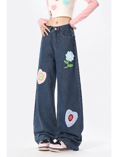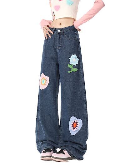 ブルージーンズ レディース 刺繍 ハイウエスト ルーズストレート カジュアル ワイドレッグ ロングパンツ