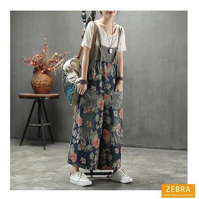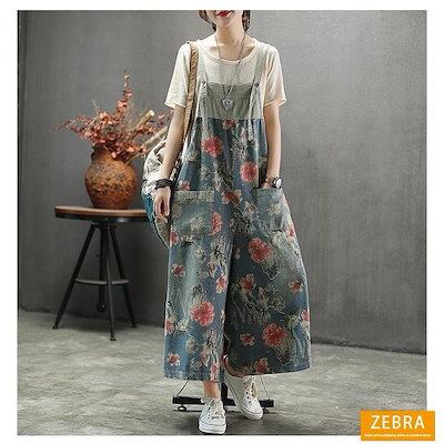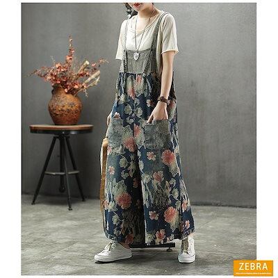 サロペット デニム ゆったり 花柄 レディース オーバーオール オールインワン 綿 コットン ワイドパンツ ボトムス