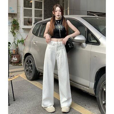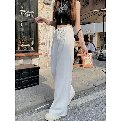 ホワイト ハイウェスト ワイドパンツ レディース デニムボトムス 春夏 ゆったり 着痩 せ ギャザー デザイン感 モップパンツ