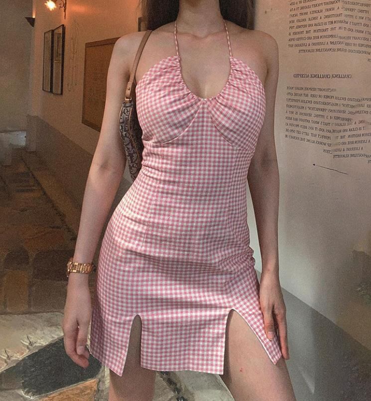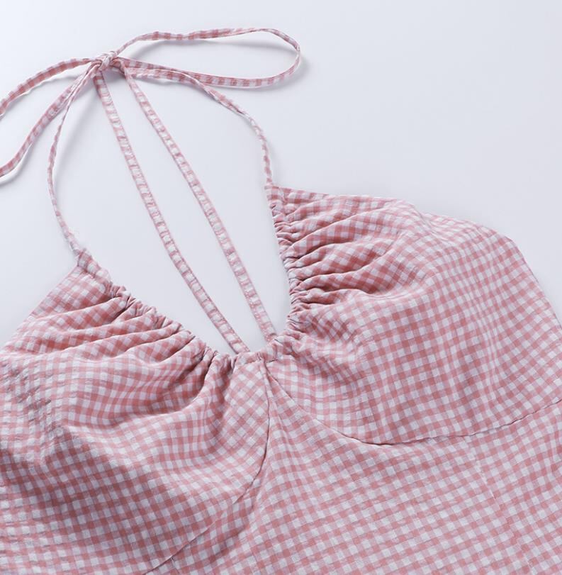 春夏新作 女 レディース ハイウエスト 袖なし チェック柄 吊りスカート ミニ ワンピース ドレス
