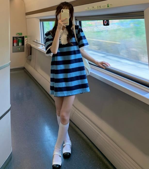 2022春夏新作 女 レディース ハイウエスト 半袖 ボーダー柄 ミニ ワンピース ドレス 台型スカート