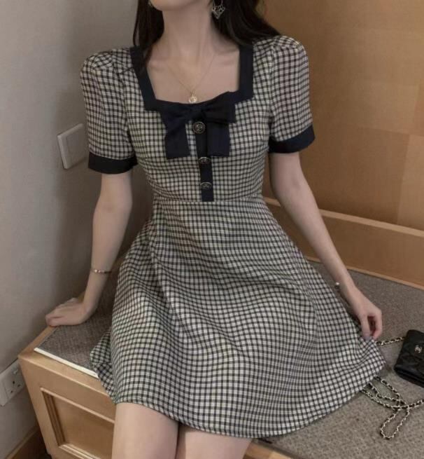 2022春夏新作 女 レディース ハイウエスト 半袖 チェック柄 ミニ ワンピース ドレス 台型スカート S-2XL