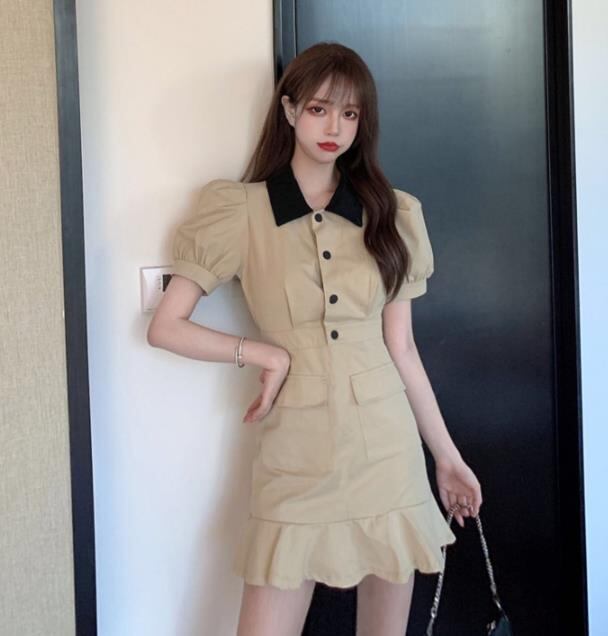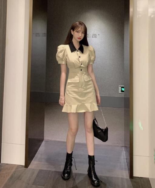 2022春夏新作 女 レディース ハイウエスト 半袖 パフスリーブ ミニ ワンピース ドレス マーメイドスカート