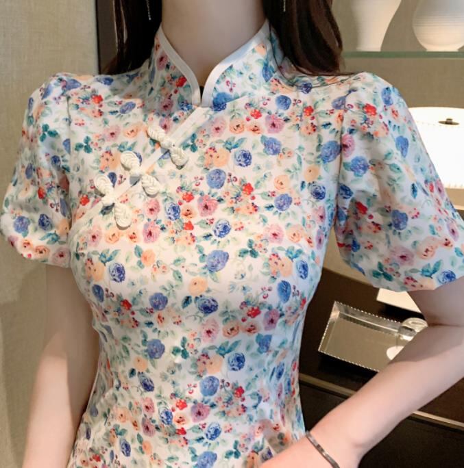 2022春夏新作 女 レディース ハイウエスト 半袖 花柄 ミニ ワンピース ドレス マーメイドスカート