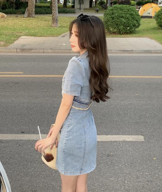 2022春夏新作 女 レディース ハイウエスト 半袖 デニム ミニ ワンピース ドレス タイトスカート