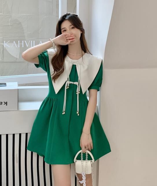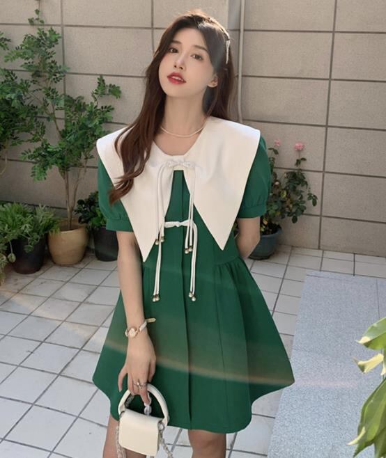 春夏新作 女 レディース ハイウエスト 半袖 パフスリーブ ミニ ワンピース ドレス 台型スカート S-L