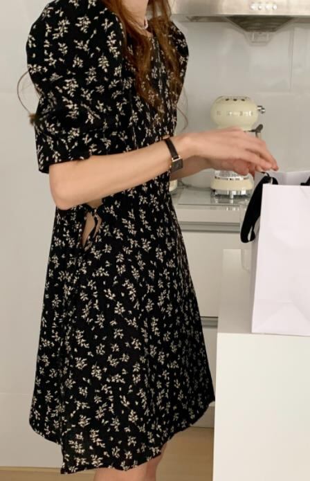 春夏新作 女 レディース 半袖 花柄 パフスリーブ ハイウエスト ミニ ワンピース ドレス 台型スカート
