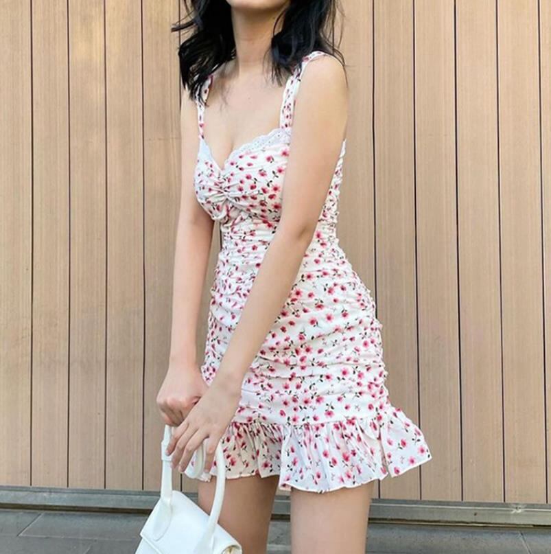 春夏新作 女 レディース ハイウエスト 袖なし 花柄 吊りスカート ミニ ワンピース ドレス タイトスカート