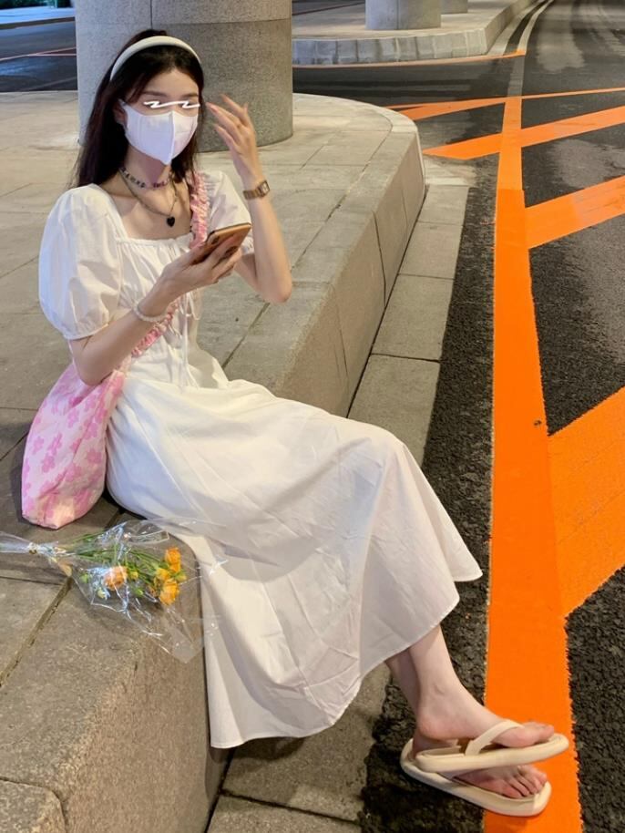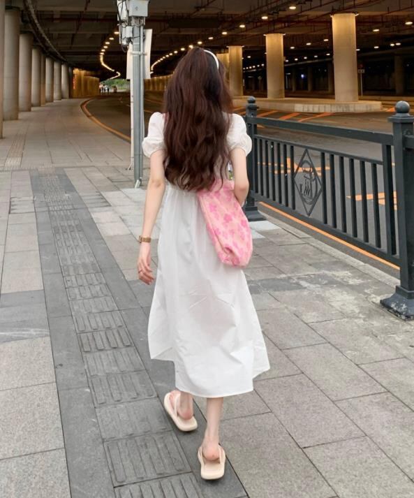 2022春夏新作 女 レディース ハイウエスト 半袖 パフスリーブ ロング ワンピース 台型スカート S/M
