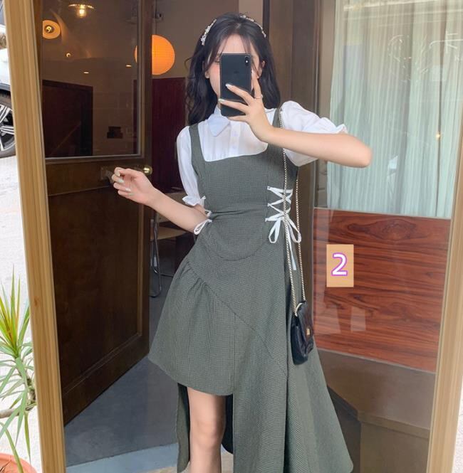 2022春夏新作 女 レディース ハイウエスト 半袖 ロング ワンピース 台型スカート 2色 S-L