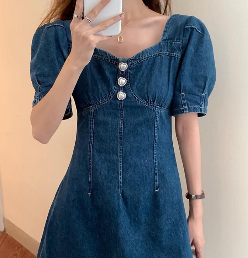 2022春夏新作 女 レディース ハイウエスト 半袖 デニム パフスリーブ ミニ ワンピース ドレス 台型スカート